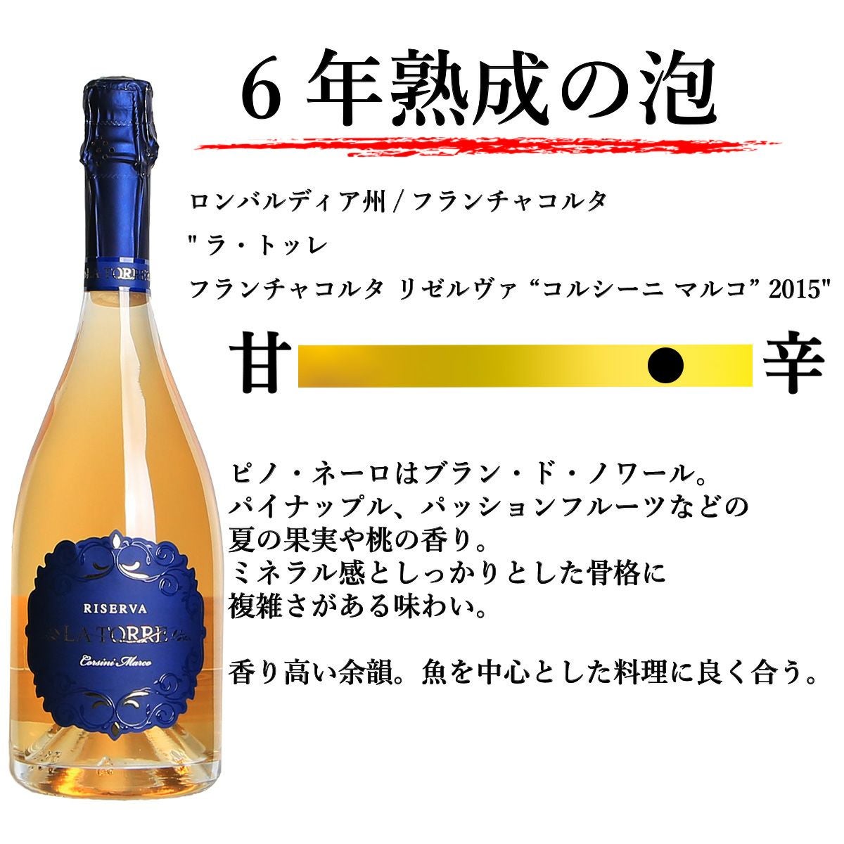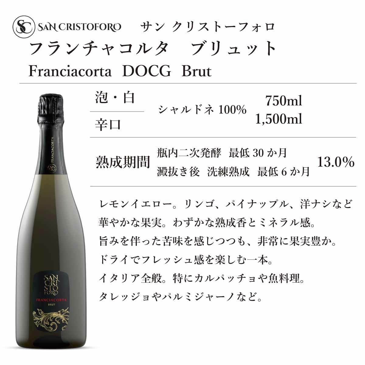 他の画像を見る お得な6本セット サンクリストーフォロ フランチャコルタ ノン・ドザート (750ml) [泡・白 ] 6本 送料無料 定価 ¥ 47,850 のところ 価格 ¥ 38,280 税込 カートに入れる お気に入りに登録する